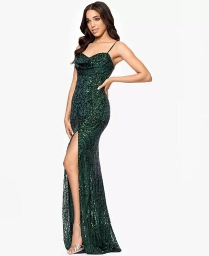 Vestido Esmeralda Sundae con lentejuelas, un diseño deslumbrante que irradia glamour y elegancia. Su escote corazón y espalda abierta aportan un toque sofisticado y femenino, mientras su silueta larga y fluida ofrece movimiento y presencia, ideal para destacar en eventos especiales y graduaciones.
