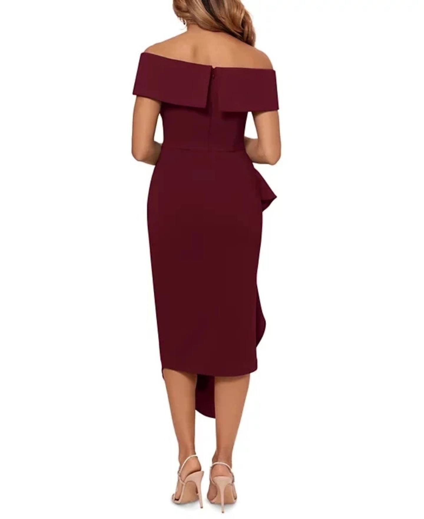 Betsy & Adam, la quintaesencia de la sofisticación, añade toques coquetos a este vestido de largo midi con un escote que deja los hombros al descubierto y un volante en cascada.
