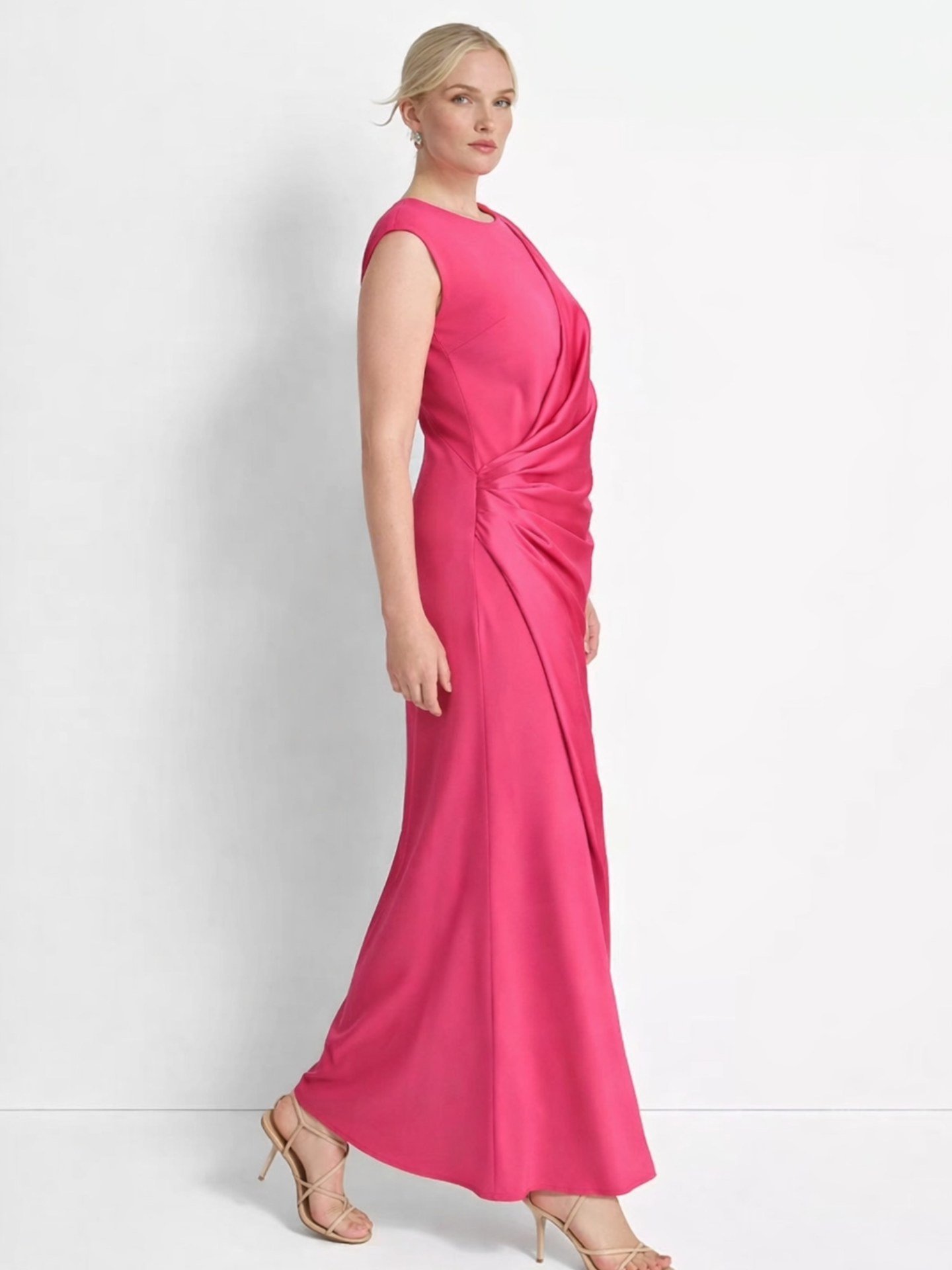 Vestido largo de fiesta con elegante drapeado frontal y delicado escote asimétrico con sutil abertura. Diseño entallado que estiliza la silueta, ideal para madres de novios, matrimonios y eventos formales. Confeccionado en tela satinada elasticada que entrega comodidad y un ajuste favorecedor.